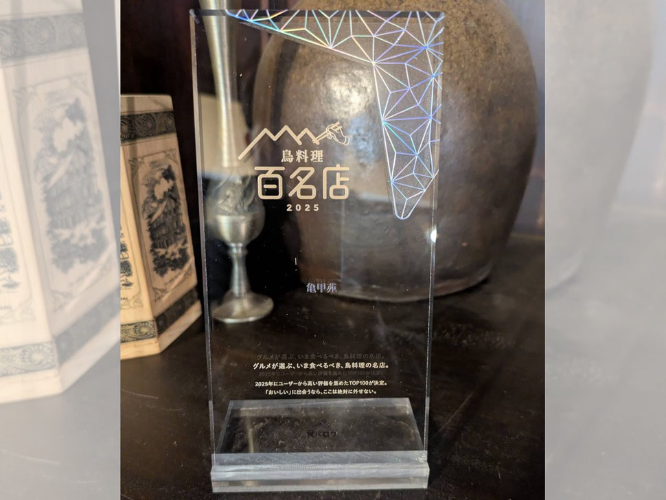 いま食べるべき鳥料理の名店ということで、食べログユーザーから高い評価を集めた100店の中に2025年、亀甲苑が選出されました。今「おいしい」に出会うならここは絶対外せない、だそうです。評価してくださった食べログユーザーの皆様、ありがとうございました。