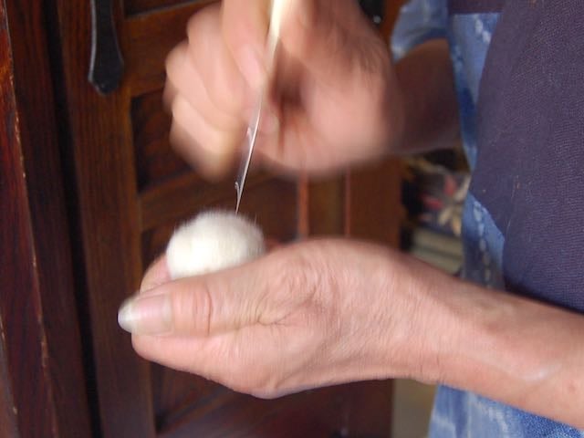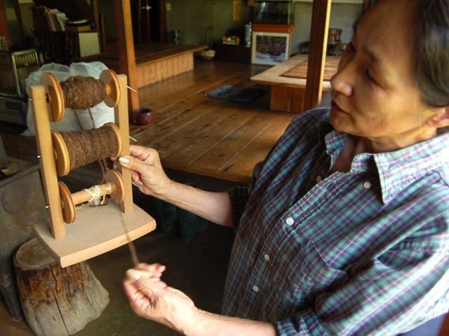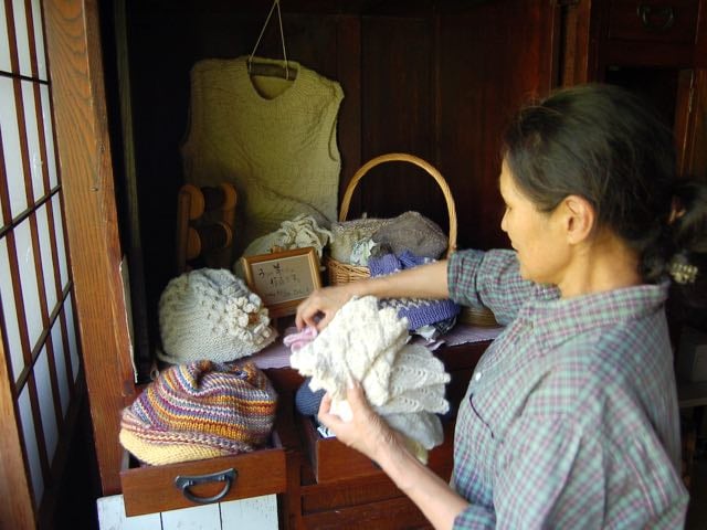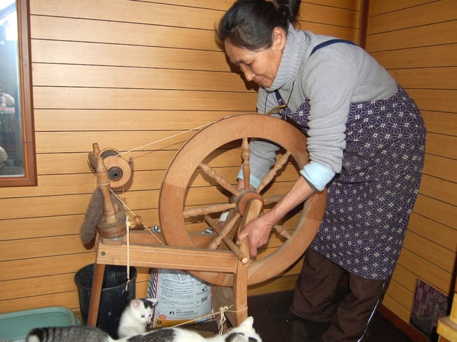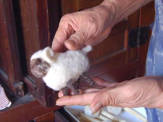 刈り取った羊たちの毛を洗って、つむぎ車でつむいで糸にします。その糸でベスト、帽子、手袋を作ったり、フェルトにしてネコや羊を作ったりして展示しています。販売もしていますので声をかけてください。