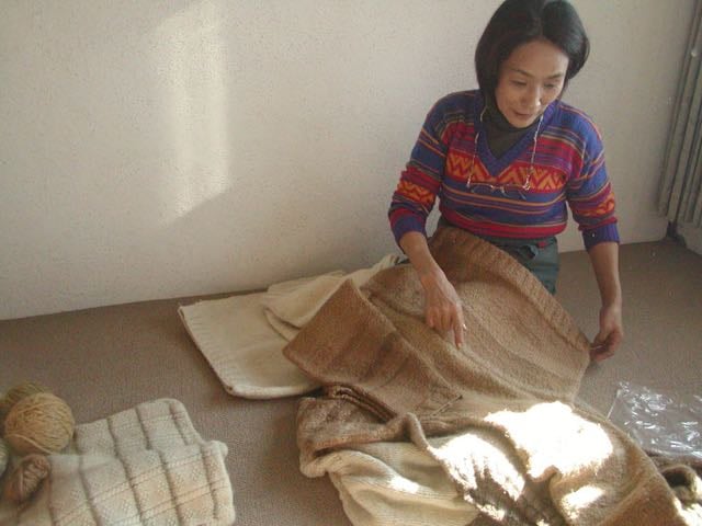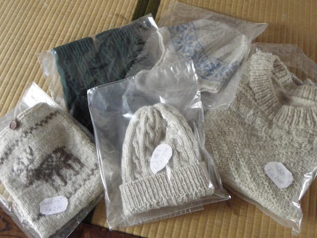 ウチの羊たちから刈り取った毛で紡ぎ糸を作り、それで編んだグッズがあります。ベストや帽子、ショルダーバッグなどです。けっこう評判いいです。手作りなので数がありませんが、あったら池の平にいらっしゃった時のお土産やプレゼントにどうぞ?