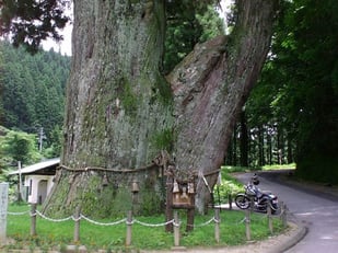 長野県第1位の巨木で、昭和19年国の天然記念物に指定されました。樹齢1,800年、幹廻り14m、樹高40m。この大杉は、昔から虫歯に病む者が祈願すると霊験が著しいと語り継がれています。
