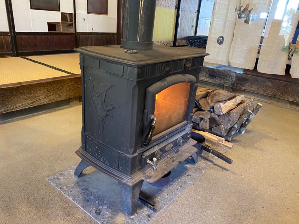 ※2021年11月に改修工事を行い、庭の景色を広く眺めながら囲炉裏でお食事をしていただけるよう、明るく大きな掃き出し窓にしました。また、お手洗いはきれいな洋式シャワートイレに改装、気持ち良くご利用いただけます。薪ストーブ周りの土間も新しくなっています。